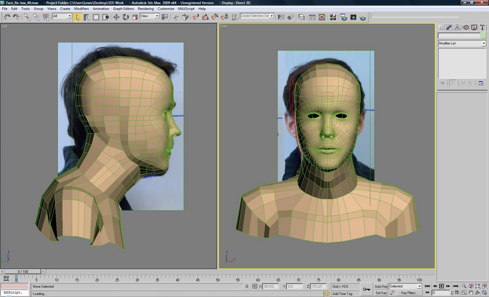 Finally I created two planes in 3DS Max. The reference image was then placed on both these planes. I then moved the two planes into position so that the left side of my head could be viewed from the left viewport and the front of my head could be viewed from the front viewport.